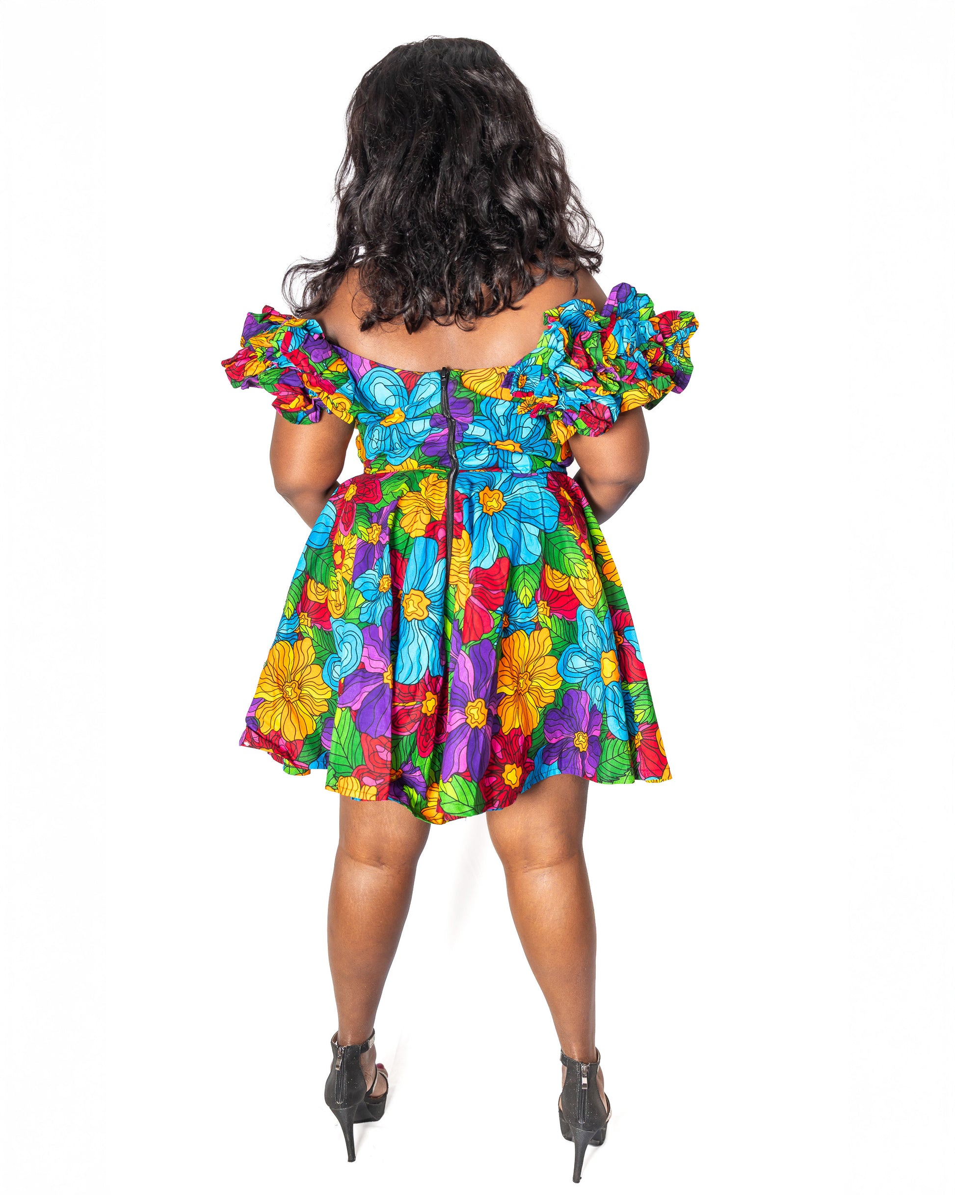 Keywords:Β Ankara floral dress, African off-shoulder dress, ruffle sleeve mini, African fashion made in Africa